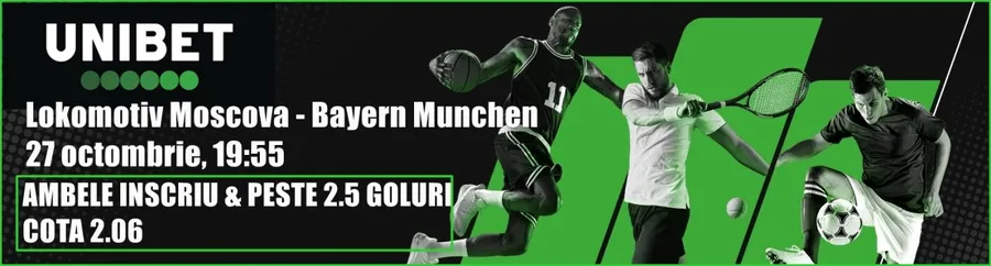 - Lokomotiv Moscova vs. Bayern Munchen, marți 27 octombrie, 19:55 – GG & peste 2.5 goluri COTA 2.05
