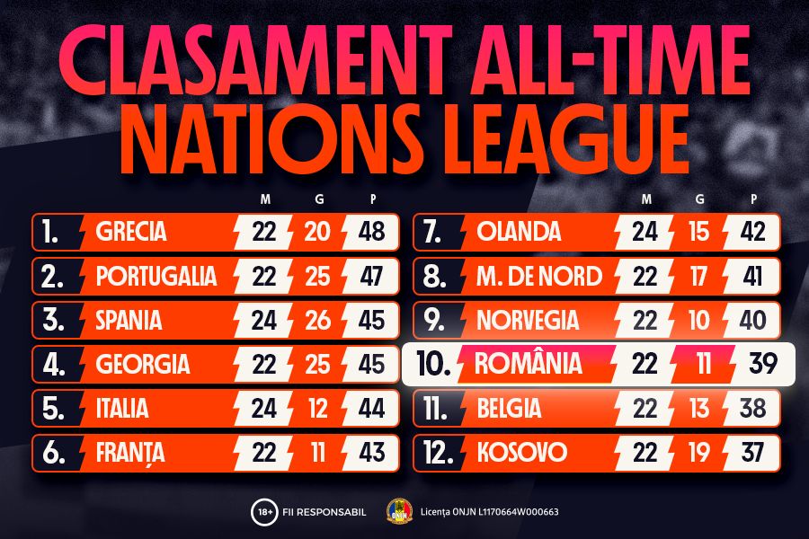 Înaintea ultimelor două etape din actuala ediție de Nations League echipa României ocupa locul 10 într-un clasament all-time în această competiție, devansând Belgia (fosta noastră adversară de la EURO 2024) și Kosovo, echipa pe care o întâlnim în etapa a 5-a.