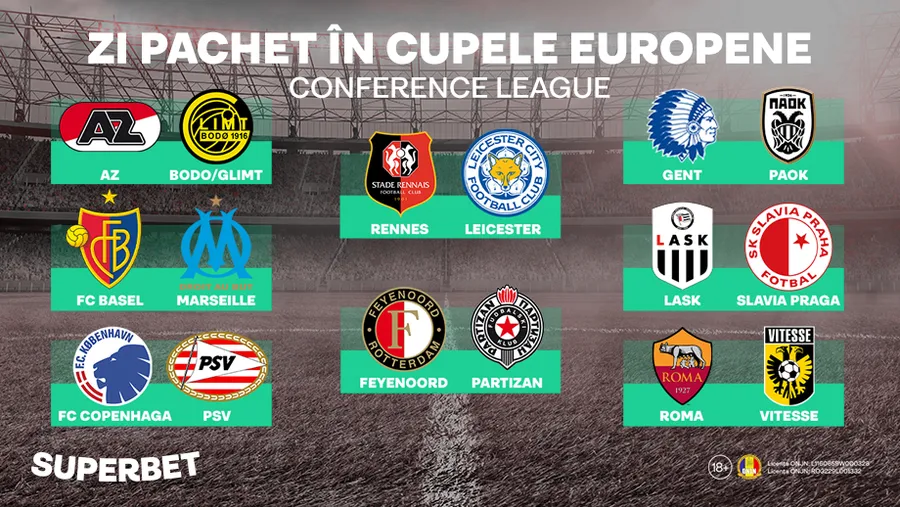 Surpriza plăcută a competiţiei rămâne Bodo/Glimt, echipă care a oferit fotbalului mare nume precum Mathias Normann (Norwich) sau Jens Petter Hauge (ex-Milan). Norvegienii au câştigat la limită, 2-1, turul cu AZ Alkmaar, fosta adversară a lui CFR Cluj. În acelaşi timp, ochii multor români vor fi aţintiţi pe meciul lui PAOK Salonic, echipă antrenată de Răzvan Lucescu şi la care evoluează internaţionalul Alexandru Mitriţă. Grecii au învins în tur, 1-0, pe Gent, iar Lucescu junior îşi continuă cursa pentru a rescrie, din nou, istoria clubului din Salonic. Vezi aici oferta Superbet pentru Conference League şi alege ce te inspiră!
