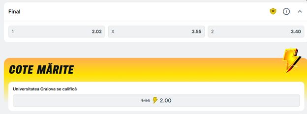 Superbet, liderul pieței de tech & entertainment din România și sponsor oficial al Universității Craiova din vara lui 2025, face un nou pas uriaș pentru industria pariurilor sportive din România: miercuri și joi, găsești pe site și în aplicația Superbet, dar și în toate agențiile din țară, o cotă specială de 2.00 (mărită de la 1.04) pe calificarea Universității Craiova în play-off-ul Conference League.