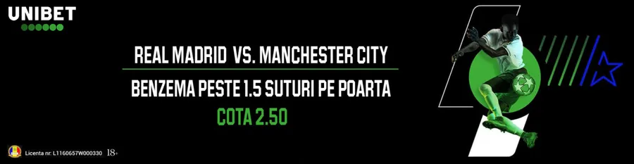 În schimb, Real Madrid mizează pe Karim Benzema, care a marcat 10 goluri în ultimele 9 meciuri ale „albilor”. În plus, el i-a dat 6 goluri în 7 partide lui City, astfel că se anunță principalul pericol pentru poarta formației lui PepGuardiola. La Unibet, pariorii pot miza pe o selecție foarte interesantă, că Benzema va trimite peste 1.5 șuturi pe poartă, la cota 2.50.