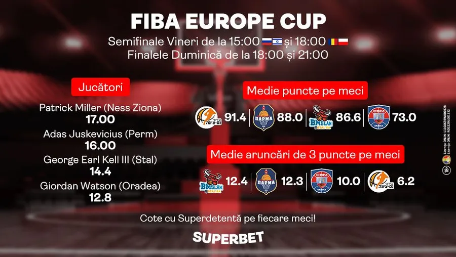 Zi istorică pentru baschetul masculin românesc pe care o poți trece în palmaresul tău de iubitor al sportului dar și de parior. CSM Oradea joacă de la 18:00 contra polonezilor de la Ostrow în Final 4 FIBA Europe Cup, la Tel Aviv! Hai și superjoacă cele mai tari meciuri de baschet, din postura de parior titular. Fă-ți cont la Superbet