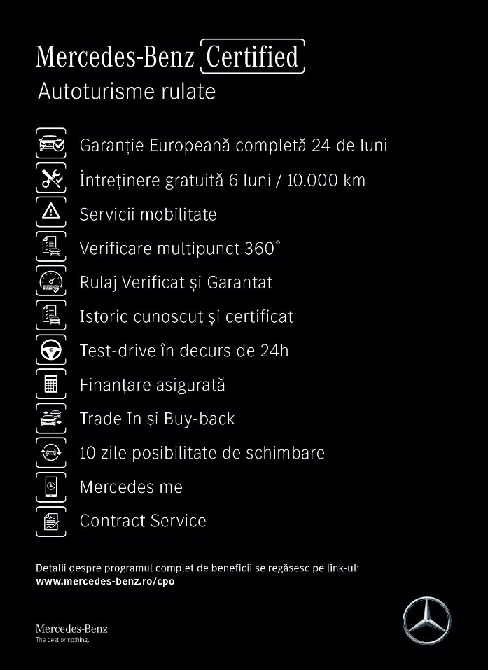 - Ai acces la toate serviciile și produsele inovatoare din universul Mercedes me, chiar dacă autoturismul face parte din programul Mercedes-Benz Certified.