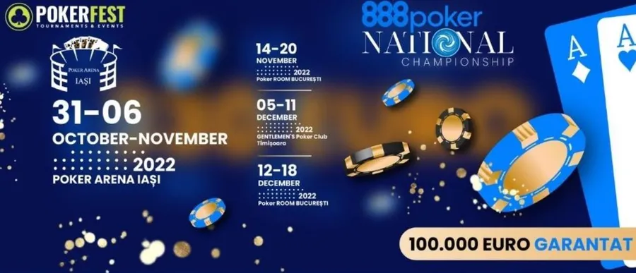 De pe 31 octombrie se va da startul la 888Poker Championship. Așa cum îi spune și numele, acesta este un campionat național de poker al României, la care câștigătorul va primi trei pachete la evenimentele #888pokerLIVE din 2023, cu o valoare estimată la peste 7.000 de dolari.