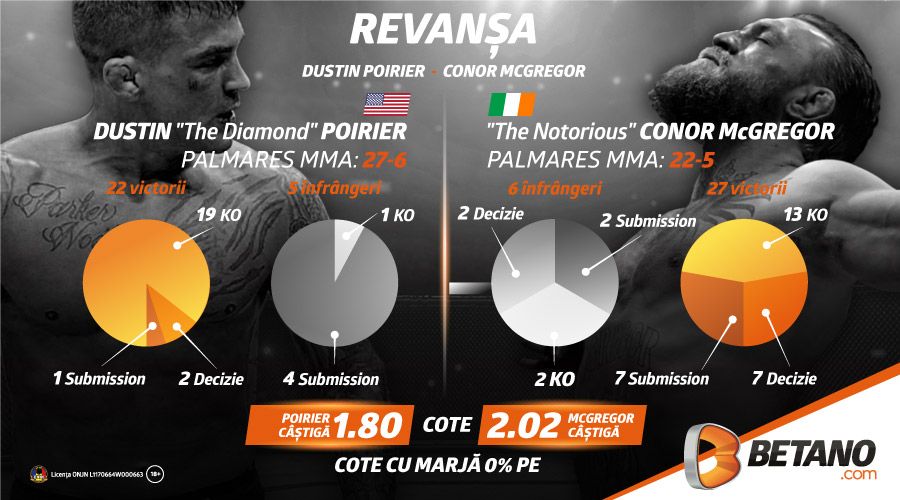 McGregor revine în ring și îl va înfrunta pentru a treia oară pe Dustin Poirier, cel care l-a învins prin KO tehnic la începutul acestui an, dar pe care îl doborâse prin același procedeu în 2014. Revanșa fostului campion mondial la două categorii va avea loc în noaptea de sâmbătă spre duminică, iar pe Betano găsești sute de pariuri pe meci!