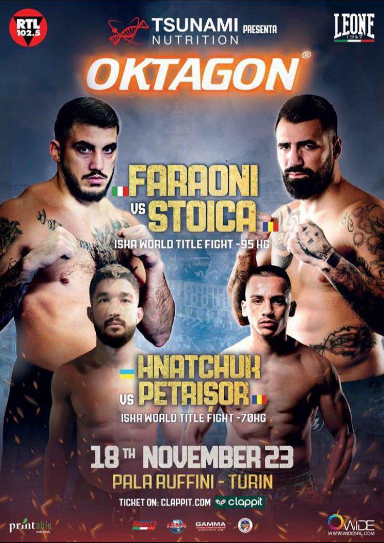 Locul 8 mondial în acest moment în topul Glory, Bogdan Stoica, revine în ring pe 18 noiembrie, la Pallaruffini din Torino, acolo unde îl va înfrunta pe italianul Mattia Faraoni într-un meci cu centura mondială ISKA pe masă. Tot în gala Oktagon, Călin Petrișor, actualul deținător al centurii europene, va lupta pentru titlul suprem în fața ucraineanului Taras Hnatchuk.