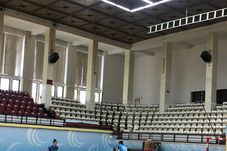Viorel Filimon, antrenorul lotului național feminin de tenis de masă, le dă indicații fetelor la antrenamente de pe scaun pentru că în următoarele două săptămâni nu are voie să pună piciorul pe jos din cauza operației pe care a suferit-o.