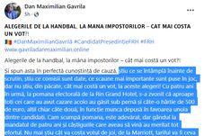 Dacă lumea handbalului a înțeles ce-a făcut Dedu din handbalul românesc, atunci nu-l vom mai avea din mandatul următor și pot să fac pariu că acest personaj va fi uitat degrabă, chiar și cei care l-au servit vor căuta să se dezică de el”, a încheiat Maximilian Gavrilă.