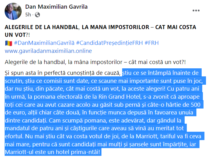Nu mai știu cât va costa votul de joi, de la Marriott, tariful va fi ceva mai mare, pentru că sunt candidați mai mulți și șansele sunt împărțite, iar Marriott-ul este un hotel prima-ntâi!”, scrie Maximilan Gavrilă pe contul său de Facebook.