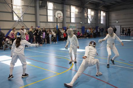 La eveniment, sportivii cadeţi de la CSM Iaşi 2020, coordonaţi de antrenorul Dragoş Sârbu, au prezentat echipamentul necesar unui scrimer şi au făcut o demonstraţie în fața copiilor pasionați de scrimă.