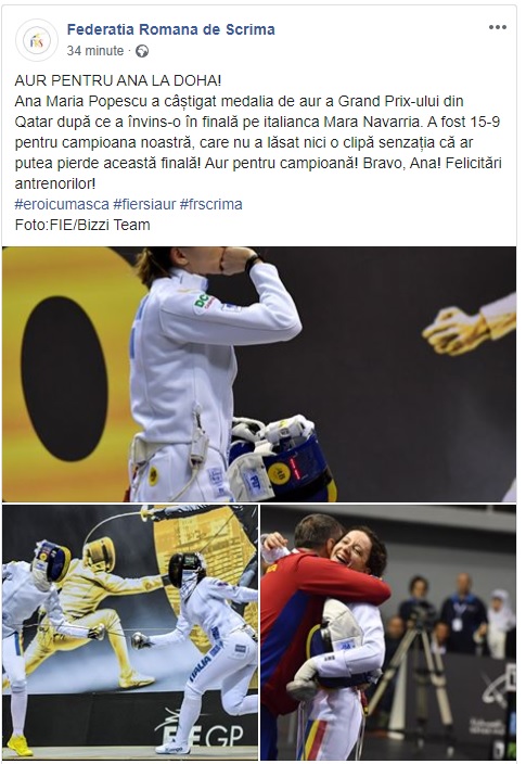 Succesul sportivei noastre a fost anunțat și pe pagina de Facebook a Federației Române de Scrimă. În postara respectivă se amintește că Ana nu a avut nicio emoție în finala competiției.
