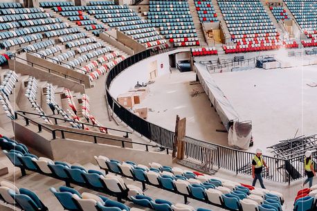 În prezent, se lucrează la montarea scaunelelor și, în paralel, se pregătește suprafața pentru parchetul sportiv. De asemenea, lucrările de finisaje, instalații și amenajările exterioare avansează rapid.