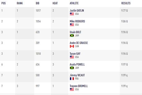 Justin Gatlin a stabilit cel mai bun timp înaintea finalei mondiale din proba regină, oprind cronometrul la 9,77 s în cea de-a doua semifinală a probei – la doar 0,03 secunde distanță de cea mai bună performanță a sezonului.