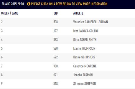 Lista de start a finalei de 200 m. Lipsesc Allyson Felix și Shelly-Ann Fraser-Pryce – care împreună, au câștigat patru dintre ultimele cinci finale mondiale de la 200 m – acum ambele alegând alte provocări mondiale