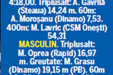 Tot aseară, Marian Oprea s-a impus în concursul de triplusalt, cu un rezultat de 16,97 m. Întrecerea continuă azi, de la ora 13:30 (intrarea e liberă).