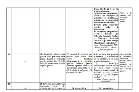 Prima coloană este alocată textului inițial al Legii Sportului (în acest caz, nu se prevedea nimic în legea din 2000), cea de-a doua coloană conține textul din OUG 38/2017 a lui Grindeanu, cea de-a treia coloană conține textul așa cum a fost votat de Senat, cea de-a patra coloană este și forma finală, cu modificările făcute în comisie și votate în plenul Camerei Deputaților. Ultima coloană este rezervată explicațiilor date de autorii amendamentelor. Așa cum se poate observa, în forma finală a dispărut mențiunea cu plafonul maxim de 5% din buget, autorii modificării explicând că se lasă la latitudinea autorităților câte procente din buget pot cheltui cu sportul