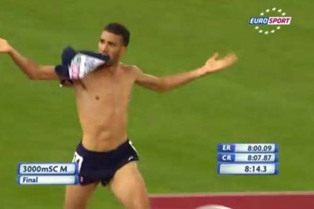 Sesiunea a doua a zilei a treia e Europeanului de atletism din Zurich a consemnat un moment unic în istoria competițiilor de un asemenea nivel. În finala masculină a probei de 3.000 m obstacole, francezul Mahiedin Mekhissi a luat un avans consistent la intrarea pe ultima turnantă și simțind că a aurul nu-i mai poate scăpa, el și-a scos maioul! A alergat cu el în dinți pe ultima sută de metri spre uimirea unui stadion întreg și spre mirarea oficialilor din arenă. Cum regulamentul forului european nu prevede descalificarea pentru o astfel de reacție, francezul medaliat cu aur a primit doar un cartonaș galben.
