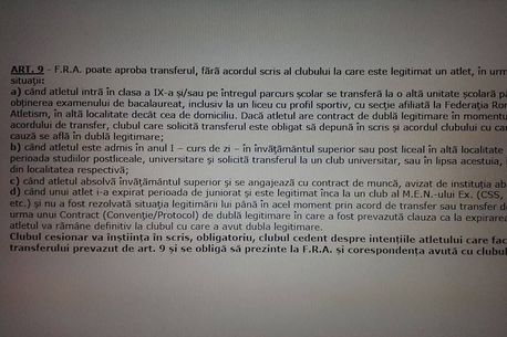 punctul a): când atetul intră în clasa a noua și/sau pe întregul parcurs școlar când se transferă la o altă unitate școlară până la obținerea examenului de bacalaureat, inclusiv de la un liceu sportiv cu secție afiliată la FRA, în altă localitate decât cea din domiciliu. Dacă atletul are contract cu dublă legitimare în momentul depunerii acordului de transfer, clubul care solicită transferul e obligat să depună și în scris acordul clubului cu care atletul în cauză se află în dublă legitimare.