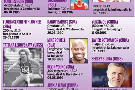 La CM de atletism de la Daegu, care va începe mâine, atenția va fi polarizată și de doborârea recordurilor mondiale. Cel mai rapid om din lume, Usain Bolt, s-a jucat cu timpul așa cum a vrut în ultimii trei ani. Există însă o serie de recorduri de neatins, stabilite în urmă cu un sfert de veac, care tronează și astăzi în arhivele atletismului. O serie de performanțe validate, chiar dacă asupra lor planează suspiciunea că nu ar fi tocmai curate.