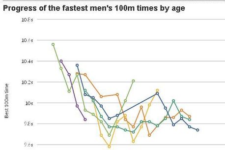 Interesant, Usain Bolt alerga doar 10.03 la 20 de ani. Din graficele respective reiese faptul că Bolt, Gay & Co au stabilit performanțele de vârf după 22 de ani.