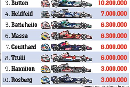 În 2006, tot la Renault, Alonso primea numai 6 milioane! McLaren a făcut o afacere bună: deși i-a crescut veniturile lui Hamilton de la 600.000 la 3.000.000 de euro, a făcut o economie serioasă cu Kovalainen, care câștigă „doar“ 1,6 milioane.