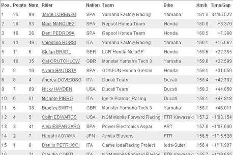 Campionul mondial în exercițiu al clasei MotoGP, spaniolul Jorge Lorenzo, a reușit să câștige Grand Prix-ul de la Misano la capătul unei curse pe care a condus-o din primul și până în ulimul viraj. Lorenzo a beneficiat din plin de cutia de viteze „seamless” cu care Yamaha s-a prezentat în San Marino și pare să țină vie lupta pentru titlul mondial. Victoria de la Misano l-a adus pe Lorenzo pe locul doi la general, la egalitate cu Dani Pedrosa.