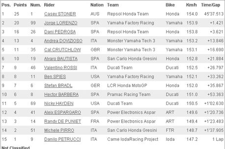 Singurele evenimente care au mai ridicat pulsul privitorilor au fost legate de startul bun al lui Jorge Lorenzo, cel care a ajuns de pe 4 pe locul 2, dar și de lupta continuă pentru locul 4 dintre piloții Yamaha Tech 3, Dovizioso și Crutchlow, tranșată de italian. Dacă pilotul Yamaha a terminat pe 2 și a limitat pagubele, fiind la un singur punct distanță la general de Stoner, podiumul a fost completat de Dani Pedrosa, veșnic în umbra pilotului cu care a făcut echipă la team-ul japonez.