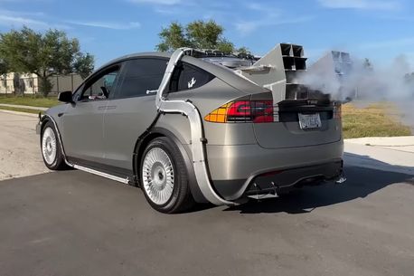 Este vorba despre o Tesla Model X Plaid, care este și unul dintre cele mai puternice SUV-uri electrice de serie din lume, cu cei 1.020 CP de la trei motoare. Nu este o mașină de serie, ci un model modificat pentru a semăna cu cel DeLorean din filmul „Înapoi în viitor”.