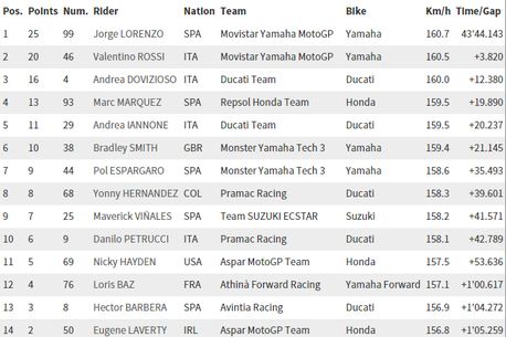 În urma rezultatelor din GP-ul Franței, Valentino Rossi își păstrează prima poziție în clasamentul general cu 102 puncte, urmat de colegul său de la Movistar Yamaha, Jorge Lorenzo, cel care a acumulat 87 de puncte.