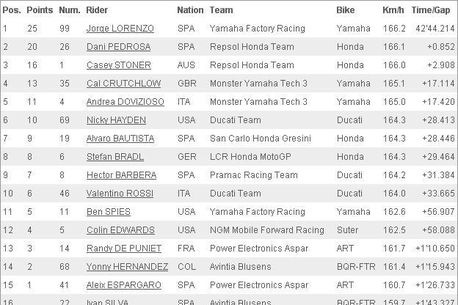 Surpriza calificărilor, britanicul Cal Crutchlow, a purtat pe toată durata cursei o bătălie în doi cu colegul său de la Yamaha Tech 3, Andrea Dovizioso. Crutchlow și-a adjudecat până la urmă al patrulea loc trecând linia de sosire la puțin peste 3 zecimi în fața italianului. Valentino Rossi a fost din nou modest, „Il Dottore” reușind contraperformanța de a termina la mai bine de 33 de secunde în spatele liderului.