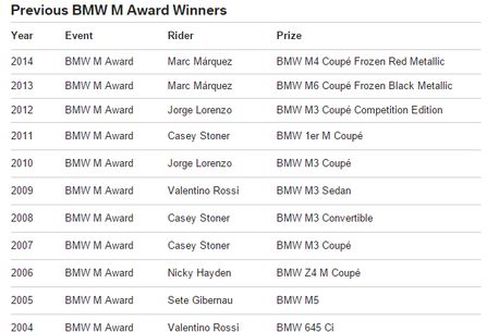 Ediția din acest an a BMW M Award pune la bătaie un model spectaculos: M6 Convertible. Potrivit bavarezilor, mașina pe care Marc Marquez este foarte aproape să o câștige are un propulsor V8 M TwinPower Turbo care dezvoltă 560 de cai putere și accelerează de la 0 la 100 km/h în numai 4,3 secunde. Este cea de-a 13-a ediție a BMW M Award, una în care Valentino Rossi și Casey Stoner sunt cei mai „titrați”: fiecare cu câte trei mașini câștigate. Clasamentul este întocmit exclusiv în baza rezultatelor din calificări, acolo unde piloții punctează în funcție de locul în grilă în același sistem precum cel de la finalul cursei.