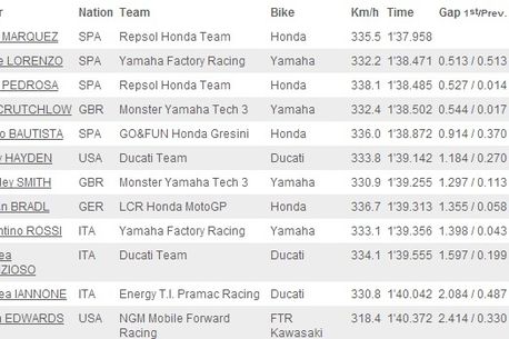 Prima linie a grilei de start va fi completată de Jorge Lorenzo, Yamaha Racing (+0,531 secunde) și de Dani Pedrosa (+0,527 secunde). Valentino Rossi nu a reușit să își găsească ritmul, italianul obținând numai a noua poziție pe grila de start, cu un timp mai slab decât al lui Marc Marquez cu 1,398 secunde.
