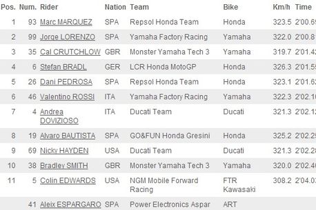 Dezamagirile zilei sunt Dani Pedrosa, doar al cincilea, cu 0.933 secunde mai lent decât Marquez și, din nou, Valentino Rossi, cel care s-a calificat pe locul șase, cu un timp mai slab decât cel reper cu o secundă și patru zecimi.