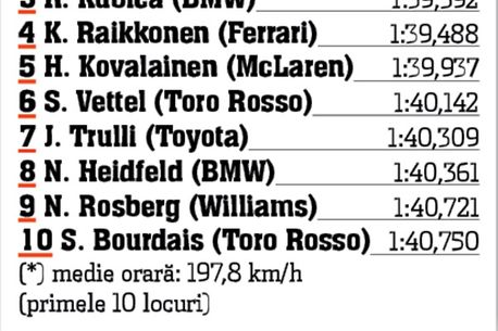 O poziție slabă (a 12-a), care n-a fost pe gustul publicului spaniol, a ocupat-o dublul campion mondial Fernando Alonso (Renault). „Sunt extrem de dezamăgit. Aveam alte pretenții aici”, a mărturisit ibericul. La polul opus s-a aflat Sebastian Vettel (Toro Rosso), care va pleca astăzi de pe locul 6. O premieră a înregistrat și colegul său, francezul Sebastien Bourdais, intrat pentru prima oară în runda 3 a calificărilor.