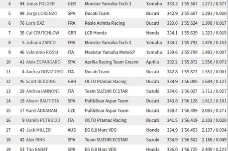 În spatele lui Vinales au venit cele două motociclete de uzină Repsol Honda. Marc Marquez a obținut un timp de 1:54.912 (+0.596), iar Dani Pedrosa se laudă cu un 1:55.210 (+0.894). Surpriza Jonas Folder de la Yamaha Tech 3 a scos al patrulea cel mai rapid timp din FP1 cu +1.271 față de Vinales. Jorge Lorenzo, la prima apariție în concurs pentru Ducati a venit al cincilea cu +1.291, în timp ce colegul lui Vinales de la Yamaha, italianul Valentino Rossi, a obținut un timp abia de locul 9. „Il Dottore”, cel care a enunțat în repetate rânduri în ultima perioadă faptul că este în urma lui Vinales cu dezvoltarea și înțelegerea prototipului Yamaha, a scos în cel mai bun tur de pistă pe Losail un 1:55.799, timp cu aproape o secundă și jumătate mai lent decât al colegului său.