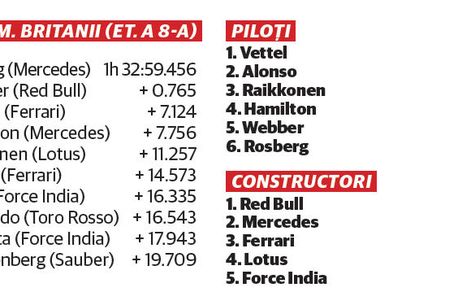 Sebastian Vettel a fost și el atenționat de la boxe că s-ar putea să aibă probleme cu „gumele”. Până la urmă, campionul mondial en-titre s-a numărat printre ghinioniștii cursei, dar problema lui a fost de altă natură, cutia de viteze. Germanul a tras pe dreapta cu zece tururi înainte de final, însă cum mașina a rămas într-o zonă periculoasă, Safety Car-ul a intrat încă o dată la Silverstone. Într-o etapă influențată de incidente, în care Hamilton și Vettel au avut de suferit, norocul s-a lipit de Nico Rosberg. Pilotul de la Mercedes a mers constant, a ajuns lider după abandonul lui Vettel și a rezistat în această postură până la final, în ciuda atacului de final declanșat de Mark Webber, care a încheiat pe doi. Fernando Alonso, care a prins ultima treaptă a podiumului, s-a numărat, de asemenea, printre beneficiarii zilei de ieri, în condițiile în care a redus la 21 de puncte diferența la „general” față de campionul mondial en-titre.