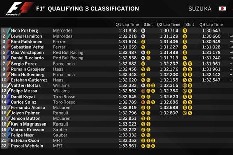 Nico Rosberg a fost cel mai rapid și în sesiunea de antrenamente, reușind același lucru și în calificările oficiale pentru Marele Premiu a Japoniei, de la Suzuka. După ce a profitat de abandonul coechipierului Lewis Hamilton în Marele Premiu al Malaeziei din urmă cu o săptămână, pilotul german a reușit să-l depășească pe britanic și în Japonia, cu doar 13 miimi de secunde, în ultimul tur.