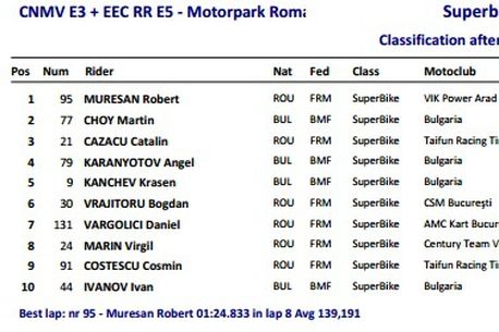 Robert Mureșan a avut cel mai bun timp al calificărilor și și-a asigurat pole position-ul în cursa de duminică, însă problemele au apărut imediat după start. Arădeanul nu a mai putut folosi sistemul de launch control al motocicletei BMW S1000 RR, motiv pentru care bulgarul Choy i-a luat fața și a intrat primul în virajul de la capătul liniei drepte. Chiar dacă problemele au continuat, Mureșan pierzând „pe traseu” și funcția de traction control, arădeanul s-a ținut aproape de Choy și, după mai multe încercări nereușite, a făcut depășirea decisivă cu opt tururi înainte de final. A urmat un final de cursă în care Mureșan a gestionat bine avantajul în fața campionului bulgar, avantaj care a fost constant în jurul a o secundă. Pilotul de 24 de ani care ne reprezintă în WSBK Superstock 1000 a trecut astfel primul linia de sosire și, cu trei victorii în trei etape, a devenit campion național la clasa SuperBike 1000.