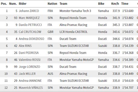 „E cel mai bun mod să începi un sezon, chiar dacă am căzut înainte de calificări. Încă de dimineață am avut un sentiment bun, faptul că am bătut recordul de cursă e un lucru bun, însă important e ce o să fie mâine în cursă. Ritmul de cursă nu este cel mai bun, însă sunt optimist„, a spus Zarco. Pilotul Yamaha Tech 3 a fost cu 0.202 secunde mai rapid decât Marc Marquez (Repsol Honda) și cu 0.207 secunde mai rapid decât Danilo Petrucci.