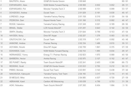 În aceste condiții, Alvaro Bautista a reușit un timp reper de 2.00:848, urmat de Aleix Espargaro cu 2.00:900 și de Pol Espargaro cu 2:00.999. Timpii sunt mult mai slabi decât cel obținut de Marc Marquez în prima sesiune de teste, atunci când pilotul Repsol Honda a reușit cel mai rapid tur de pistă din istoria circuitului – 1.59: 533.