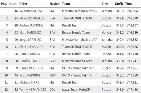 O sâmbătă extraordinară pentru Valentino Rossi! Veteranul italian de la Yamaha Racing a reușit un tur aproape de perfecțiune la Mugello, în fața unui număr uriaș de suporteri italieni, și a oprit cronometrul la 1:46.504. A fost cea mai bună prestație a lui „Il Dottore” într-un weekend care nu a fost strălucit în precedentele patru sesiuni de antrenamente libere. Valentino Rossi va pleca din pole position în fața lui Maverick Vinales, viitorul său coleg de la Yamaha, cel care a reușit un timp cu +0.094 mai slab. Prima linie la Mugello va fi completată de italianul Andrea Iannone. Acesta din urmă, viitor pilot Suzuki din 2017, a părut să fie principalul favorit pentru un timp-record în calificări după un weekend foarte, foarte rapid.