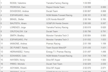 Una dintre surprizele zilei a fost dată de timpul excelent obținut de Andrea Dovizioso, pilot Ducati, cel care a venit la 0.068 în spatele lui Rossi și lui Pedrosa. În ciuda rezultatului, constructorul italian a anunțat decizia de a ieși din competiția cu celelalte două uzine importante, Honda și Yamaha, astfel că Dovizioso și Crutchlow vor concura la clasa Open. Motivul este dat de „facilitățile” oferite de Dorna în ceea ce privește permiterea dezvoltării motorului pe toată durata sezonului. Cei din clasa Open vor avea la dispoziție 24 de litri de benzină (4 litri mai mult decât piloții de uzină), posibilitatea de a îmbunătății motorul pe toată durata sezonului, o variantă în plus de gumă spate soft și un total de 12 motoare la dispoziție pe durata unui sezon, față de 5, atât cât au la dispoziție echipele de uzină.