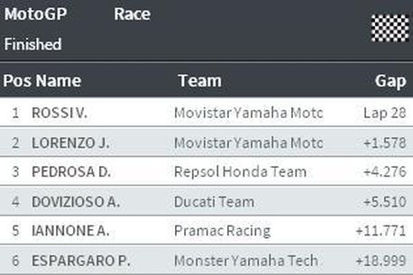 În acest context, Valentino Rossi a rămas singur la vârf și, cu o diferență constantă de circa 2,5 secunde în fața lui Jorge Lorenzo, italianul nu a avut nicio problemă în a-și adjudeca prima victorie a sezonului. Primul loc îi aduce lui Valentino Rossi și apropierea poziția secundă la general și vine să îi reamintească italianului gustul victoriei, unul pe care nu îl mai simțise din 2013, de la Assen. Podiumul de la Misano a fost completat de Dani Pedrosa, cel care în acest moment mai are un singur punct avans la general față de Rossi.