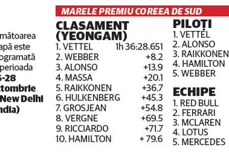 Deși cu trei runde în urmă se afla la o distanță de 35 de puncte de Fernando Alonso, neamțul a surmontat incredibil, cu patru etape înainte de final, ocupând de ieri din nou prima poziție. Colegul său Webber s-a clasat pe doi, iar Alonso a terminat pe ultima treaptă a podiumului. Lupta pentru câștigarea titlului mondial practic s-a relansat, iar finalul pare a se da la fotofiniș între Vettel și Alonso. Piloți ca Lewis Hamilton și Kimi Raikkonen au pierdut contactul cu plutonul fruntaș. Următoarea etapă este programată în perioada 26-28 octombrie la New Delhi (India).
