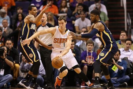Deși a fost flancat permanent de Paul George (dreapta), Goran Dragic (în alb) a fost cel mai bun marcator al lui Suns