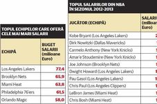 Pentru a menține liga americană pe primul loc în topul campionatelor de pe mapamond, conducătorii celor 30 de cluburi din NBA atrag superstarurile din baschetul mondial atât cu mirajul întrecerii americane, cât și cu salarii pe măsură. Astfel, conform presei de peste Ocean, cele 30 de cluburi au un fond total de salarii de 1,55 miliarde de euro. Totuși, în sporturile americane există o diferență față de sistemul european. Fiecare jucător are un plafon maxim în ceea ce privește salariul pe care îl poate primi, în funcție de situația contractuală și numărul de ani pe care l-a jucat în NBA. Însă nici acest sistem nu a împiedicat existența unor diferențe uriașe între formații. Astfel, bugetul de salarii al celor de la Los Angeles Lakers ajunge la 77,4 milioane de euro pentru acest sezon, în timp ce ultima clasată în top, Houston Rockets, nu le plătește jucătorilor săi decât 37 de milioane de euro.