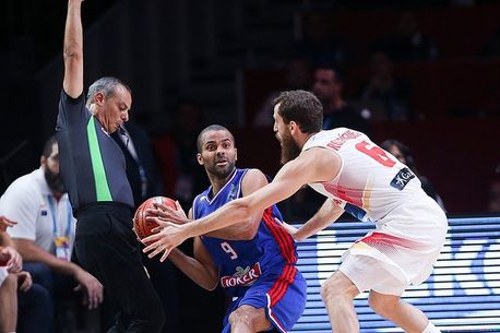 Franța a condus aproape permanent în primele 3 sferturi, chiar și fără ca starul Tony Parker să fie într-o zi de grație, cea mai bună perioadă fiind după pauza mare. Atunci, într-un interval de 10 minute, gazdele au câștigat cu 23-16. Spania a intrat în ultimele minute cu un deficit de 8 puncte, dar când în teren ai un jucător precum Gasol nimic nu este pierdut. Ibericii au profitat și de faptul că Franța a intrat rapid în penalizări, iar cu două minute și jumătate înainte de final au preluat chiar conducerea, 62-61. Gasol a dat un adevărat recital, Spania s-a desprins la 66-63 cu 16 secunde înainte de final, dar Franța a fost salvată cu un coș de trei puncte înscris de Batum. Astfel, semifinala a intrat în Overtime (scor 66-66), la fel cum s-a întâmplat și acum 2 ani, nu înainte ca Gobert să-și salveze inițial echipa de eliminare cu un „capac” de zile mari, cu 3 secunde înainte de final.