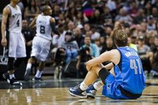 Dirk Nowitzki a privit deznădăjduit cum se bucură jucătorii lui Spurs, după victoria din meciul decisiv cu Mavericks