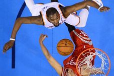 Pentru a egala recordul lui Jordan, Durant (în alb) ar trebui să marcheze cel puțin 25 de puncte într-un meci cu Houston Rockets