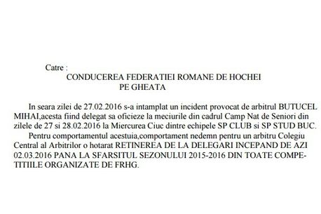 În primul rând, șeful CCA susține că a informat FRHG de suspendarea dictată împotriva arbitrului după incidentul de la Miercurea Ciuc: „Nu pe Ioan Martin trebuia să-l înștiințez”. În acest sens, a pus la dispoziția ProSport și emailul trimis președintelui forului, Mihai Covaliu: